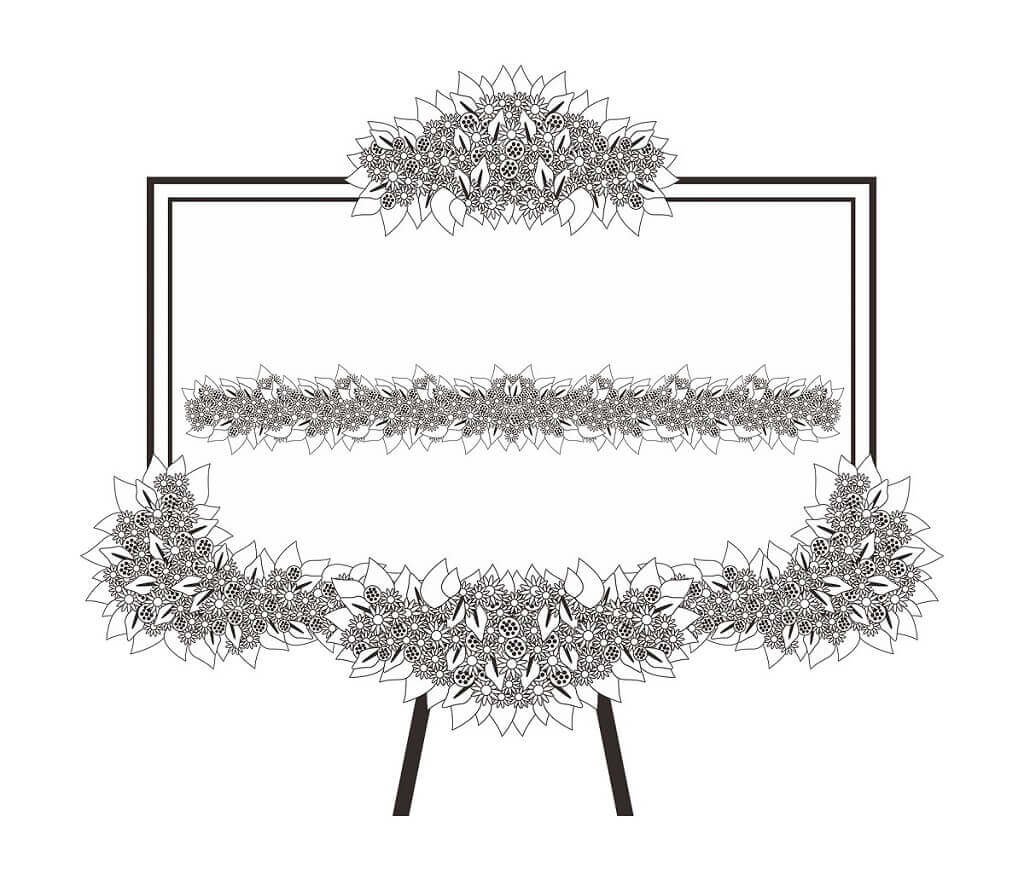 Bunga full dibawah papan, horizontal ditengah papan dan mahkota atas papan dengan kaki kayu.